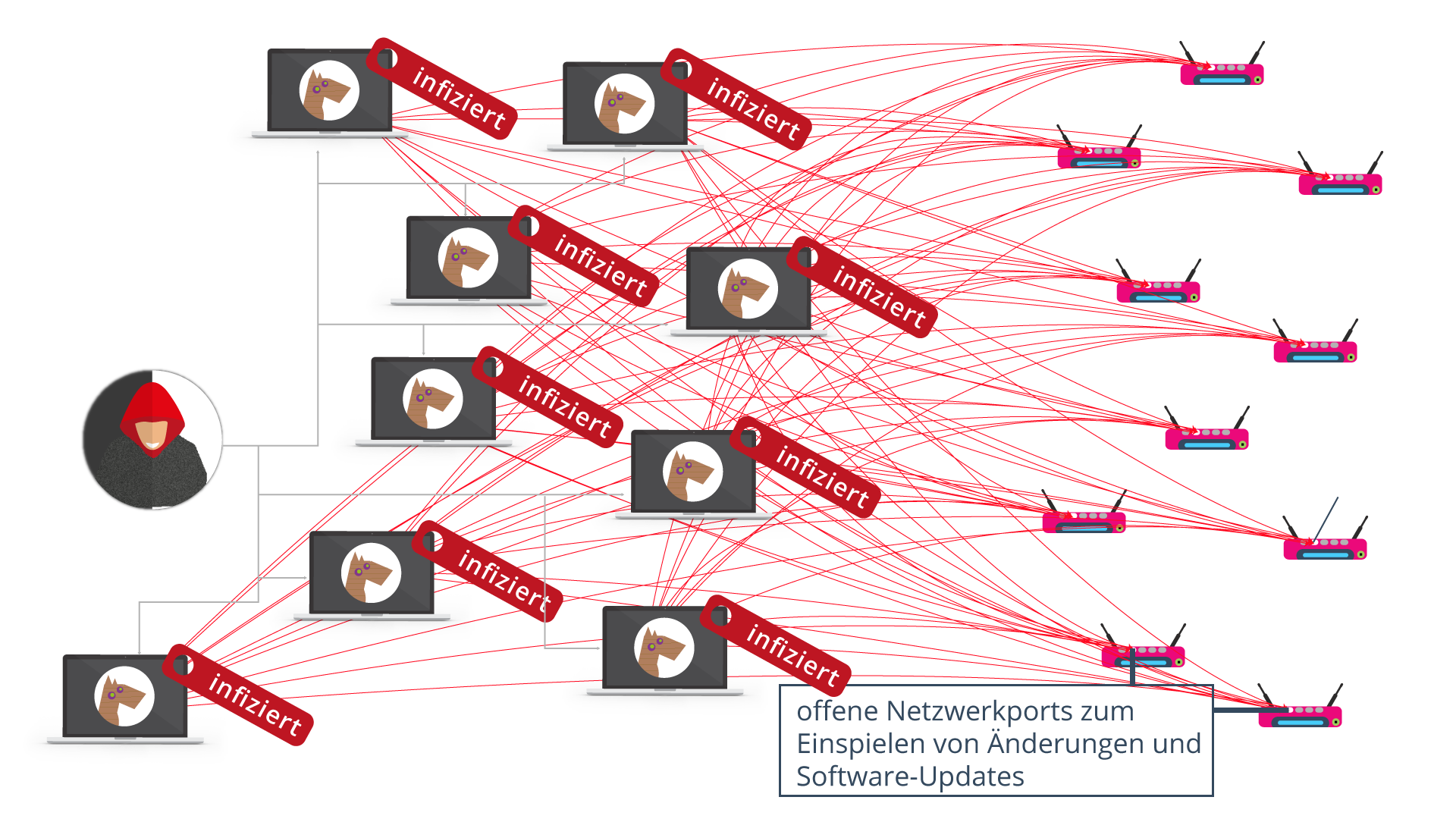 November 2016 - Das riesige und weltweit agierende Botnetz „Mirai“ griff Telekom-Router an und legte bundesweit rund eine Million von ihnen lahm. Die betroffenen Telekomkunden konnten weder ins Internet noch telefonieren. Die Telekom und die Sicherheitsexperten von Kaspersky konnten einen analysierenden Code der Mirai-Maleware zuordnen. Bei den vom Code betroffenen Stellen handelte es sich um Fernverwaltungsports von DSL-Routern. Offenbar scannten die Täter einen bestimmten offenen Netzwerkport, der für die Fernwartung genutzt wird.