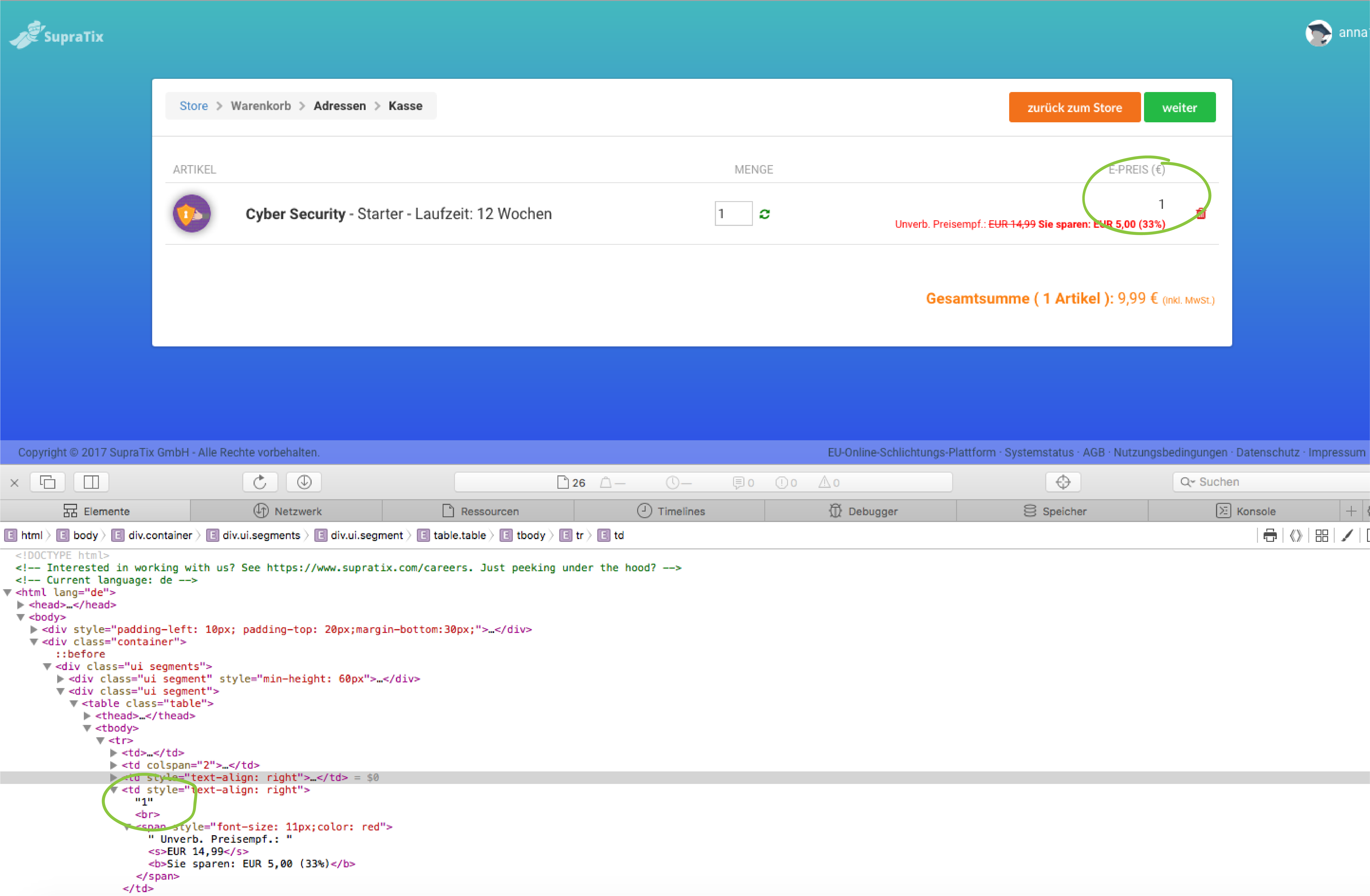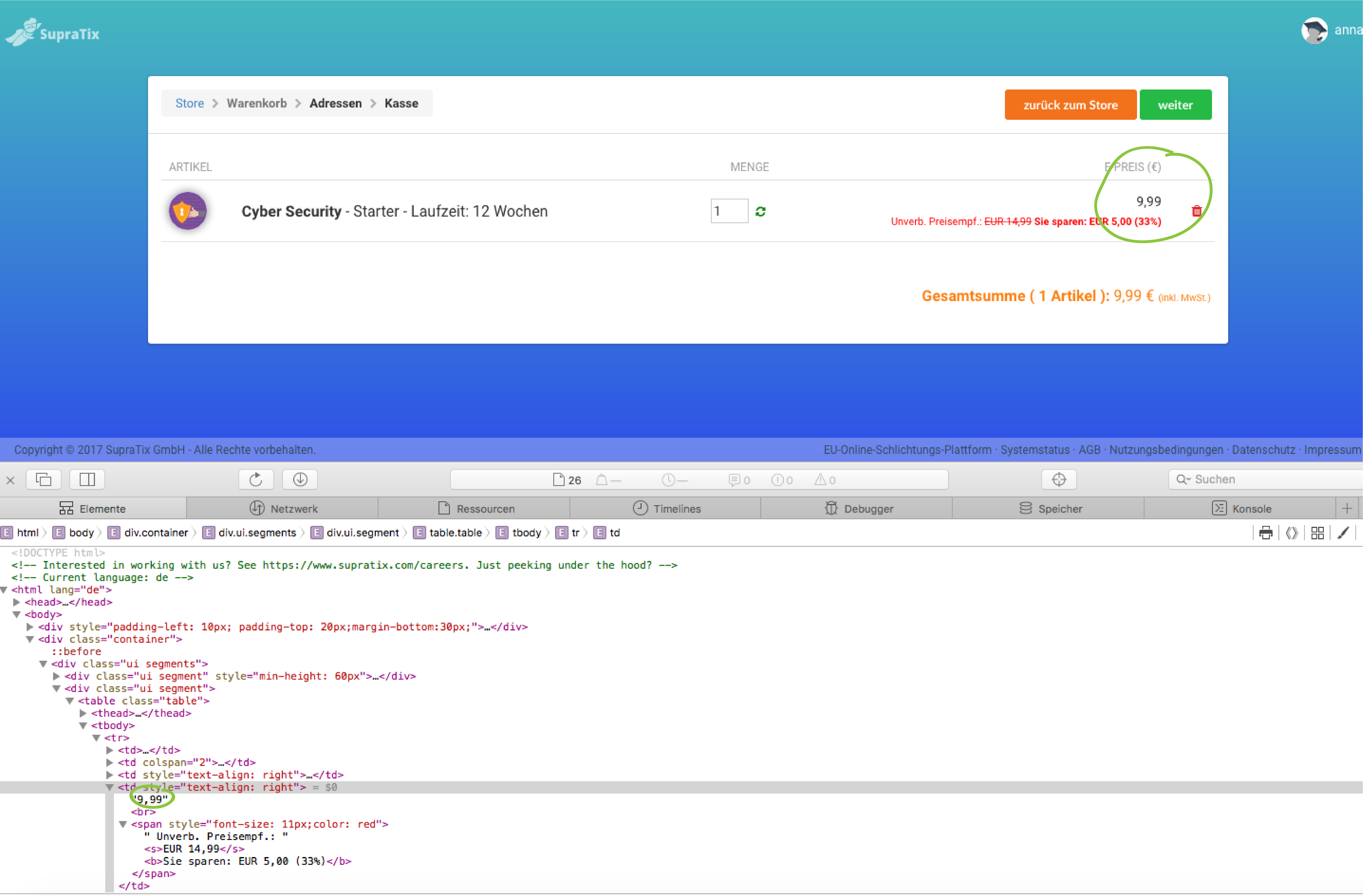 Abb. 3: Im HTML-Quelltext hat der Angreifer den Preis verändert. Da SupraTix diese Angriffsart bei der Softwareentwicklung berücksichtigt hat, wird diese Veränderung keine Auswirkungen auf den Preis des Produktes haben.