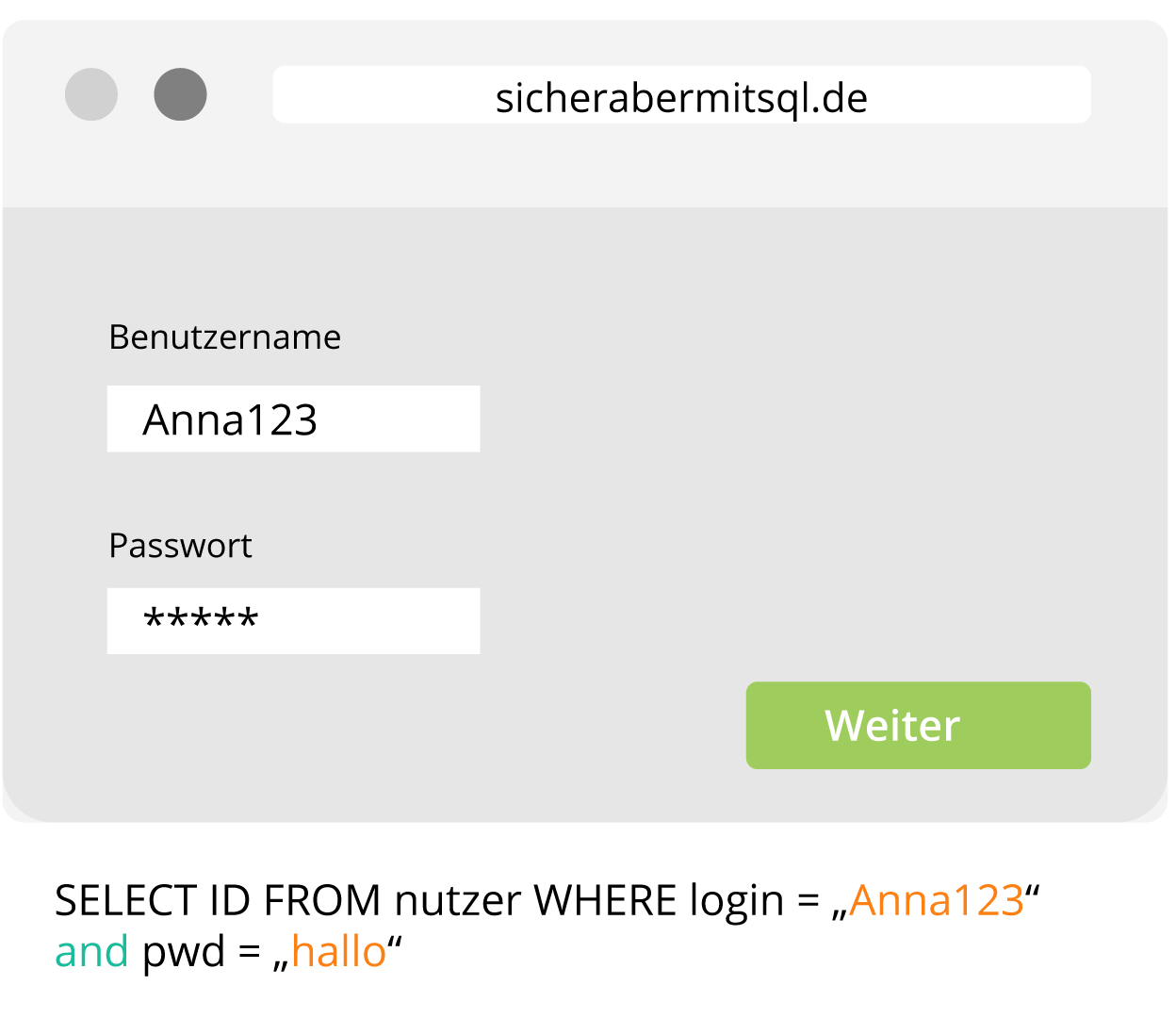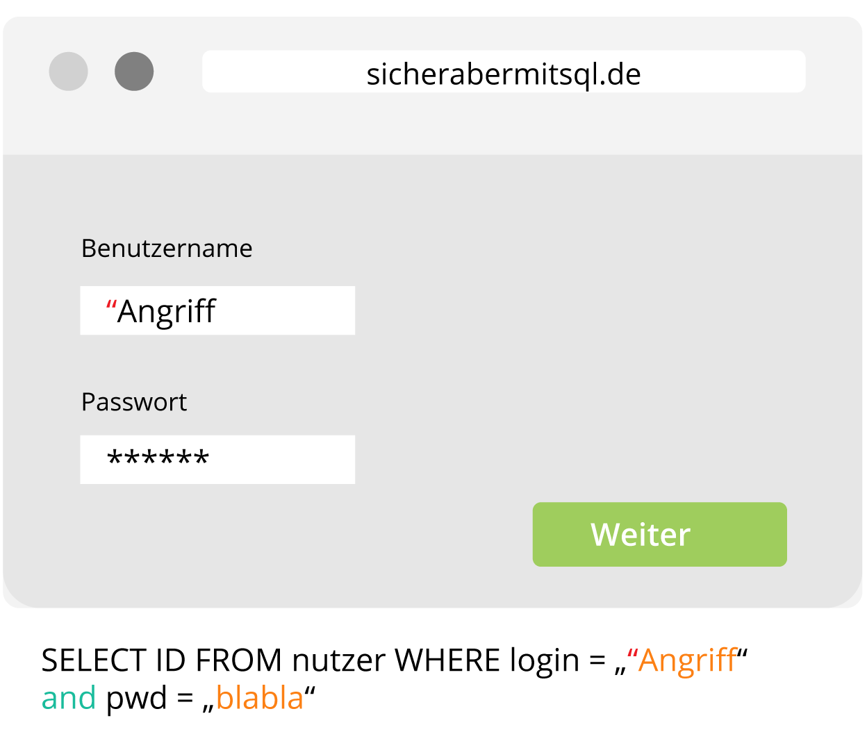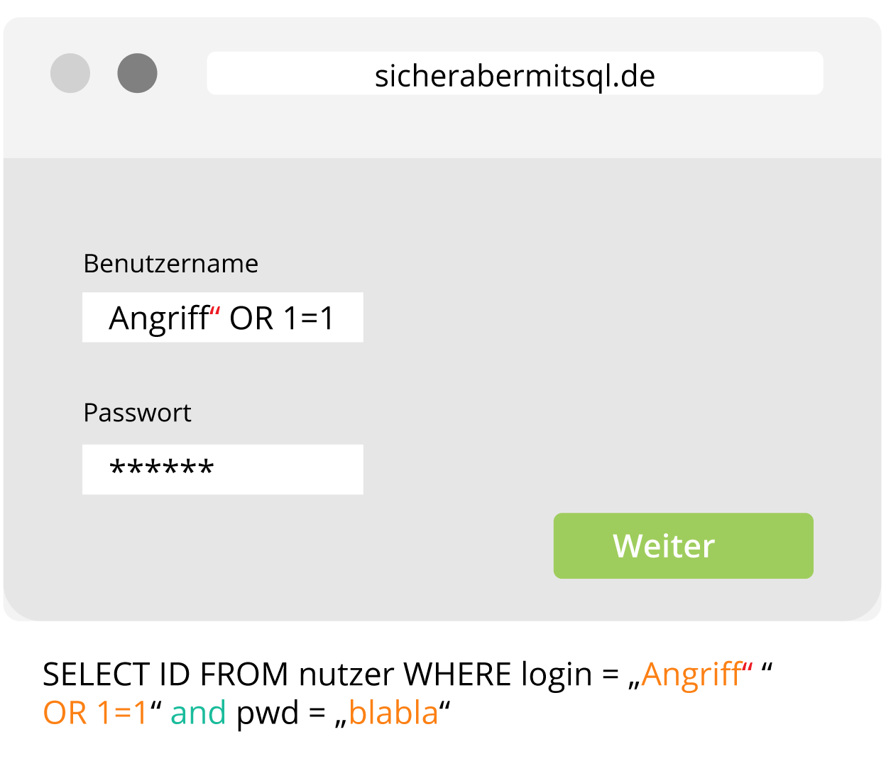Um eine SQL Injektion durchzuführen, wird, wie im folgenden Beispiel dargestellt, vorgegangen: