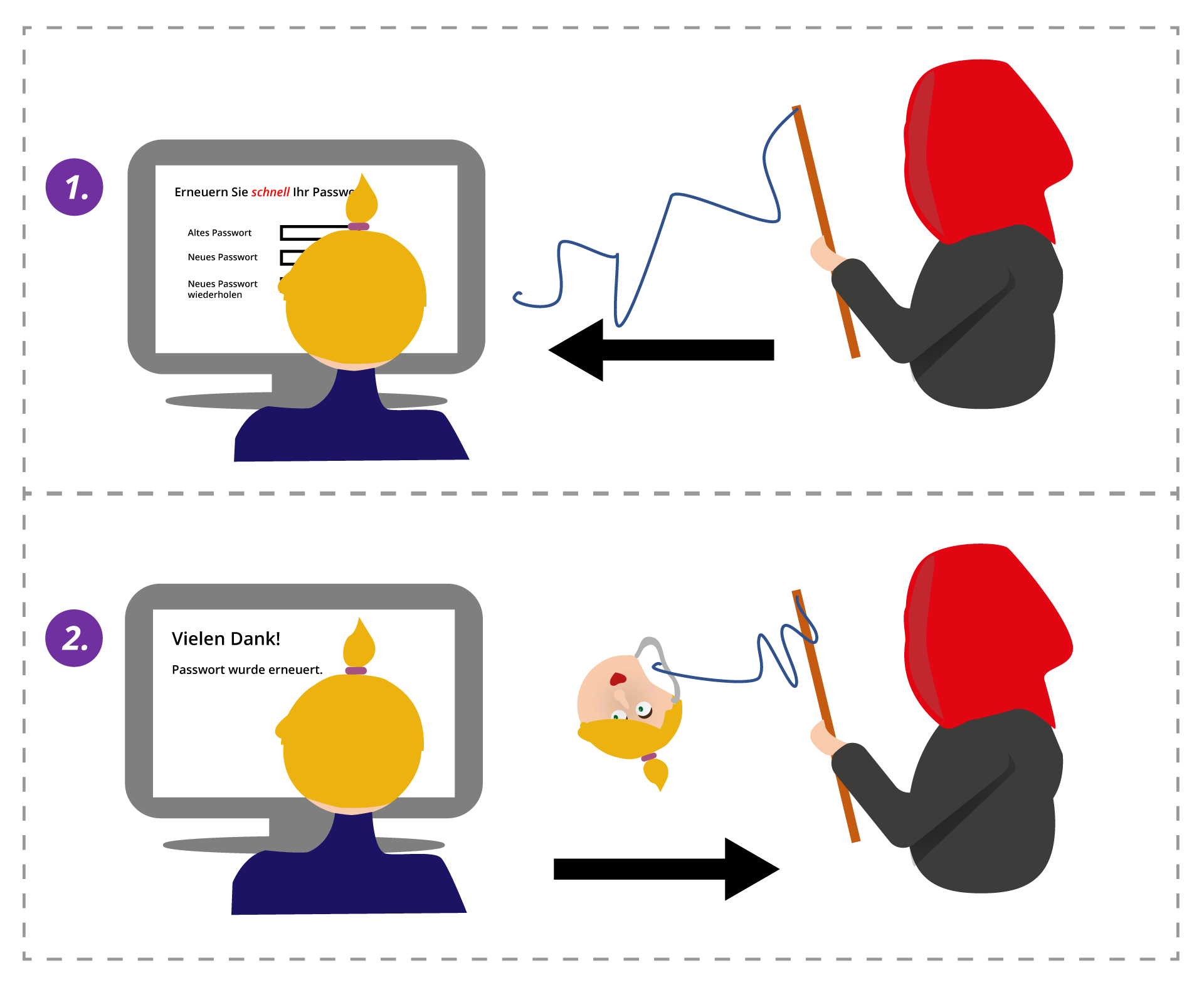 Phishing (engl. Password Harvesting Fishing = Passwort Ernte fischen) beschreibt Cyberattacken, die die Identität (persönliche Daten) des Benutzers stehlen.