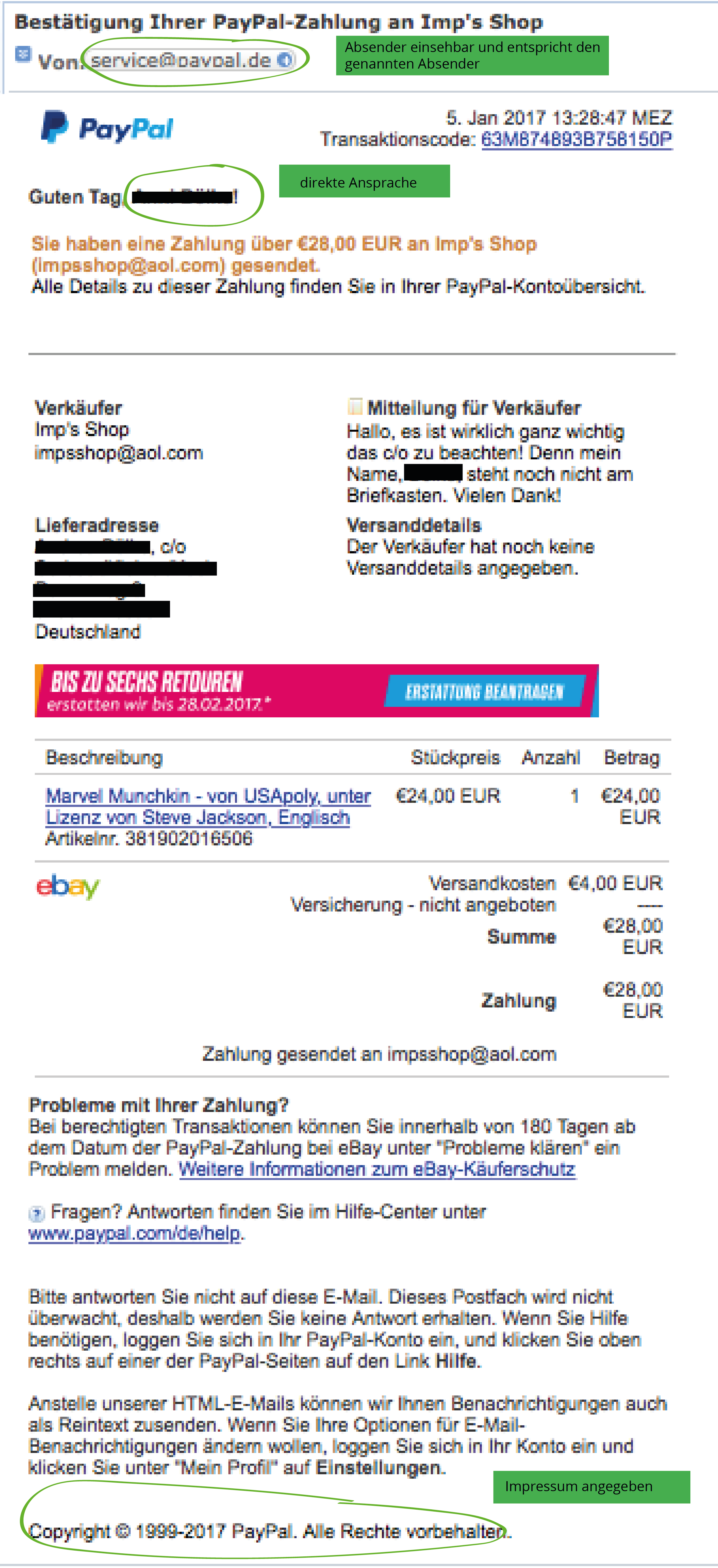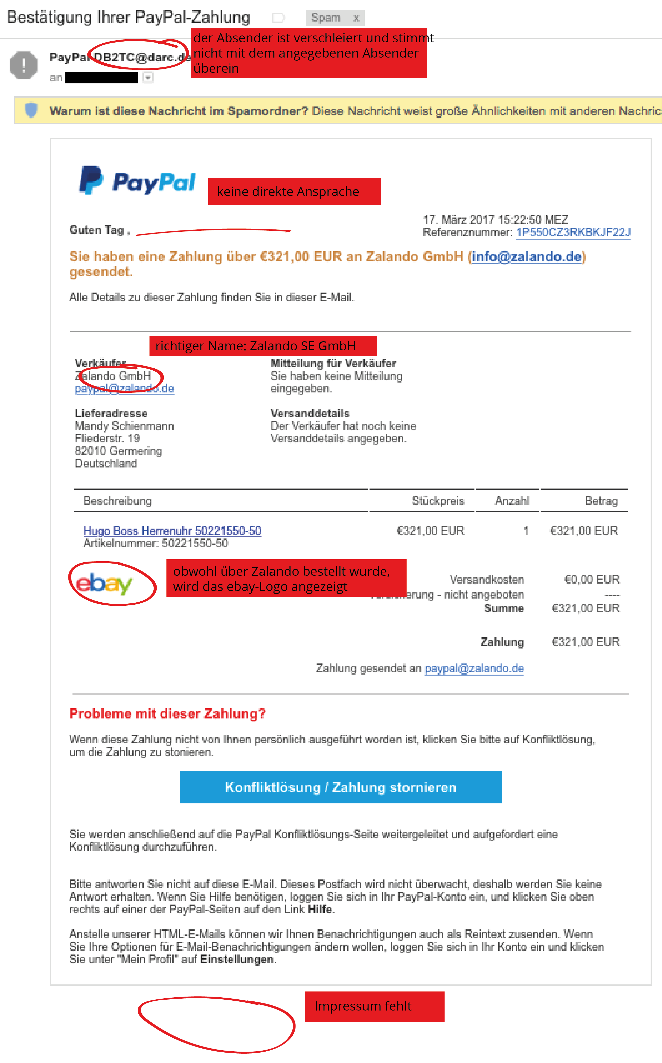 Im Folgenden sehen Sie, wie sich eine Phishing- von einer originalen E-Mail unterscheidet.