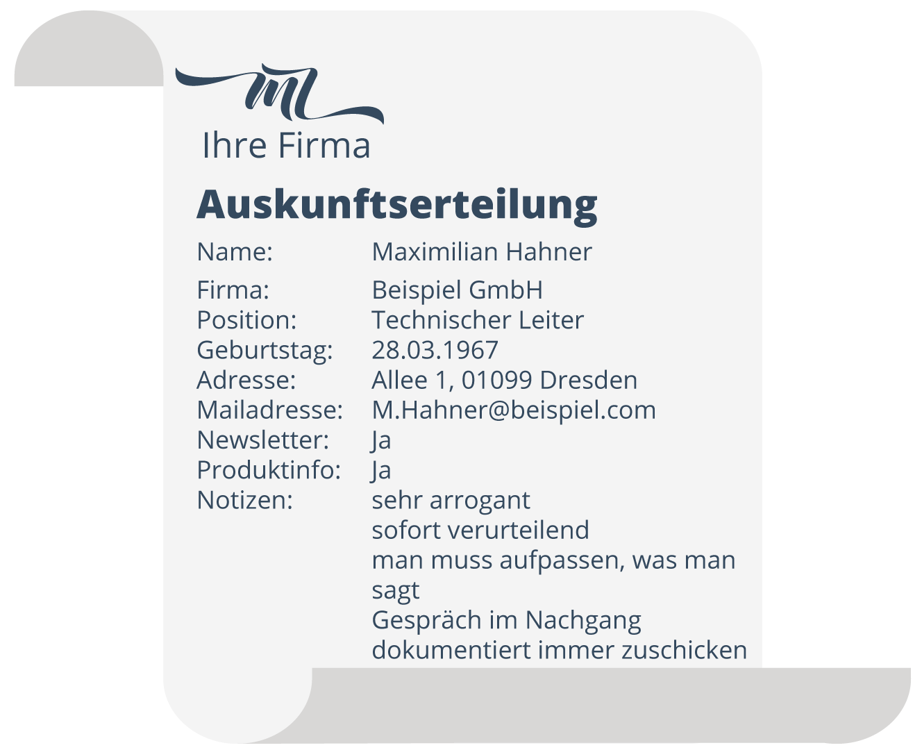 Sie müssen in Ihrem Auskunftsschreiben alle Daten aufführen, die Sie zum Betroffenen gespeichert haben, d.h. alle Informationen, die Sie im Rahmen des sechsten Schritts als personenbezogene Daten des Antragstellers identifiziert haben.