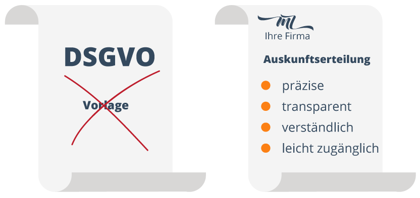 Die DSGVO enthält kein Formular zur Auskunftserteilung. Jedes Unternehmen muss das Auskunftsschreiben selbst gestalten. Sie müssen aber darauf achten, dass die Auskunft in