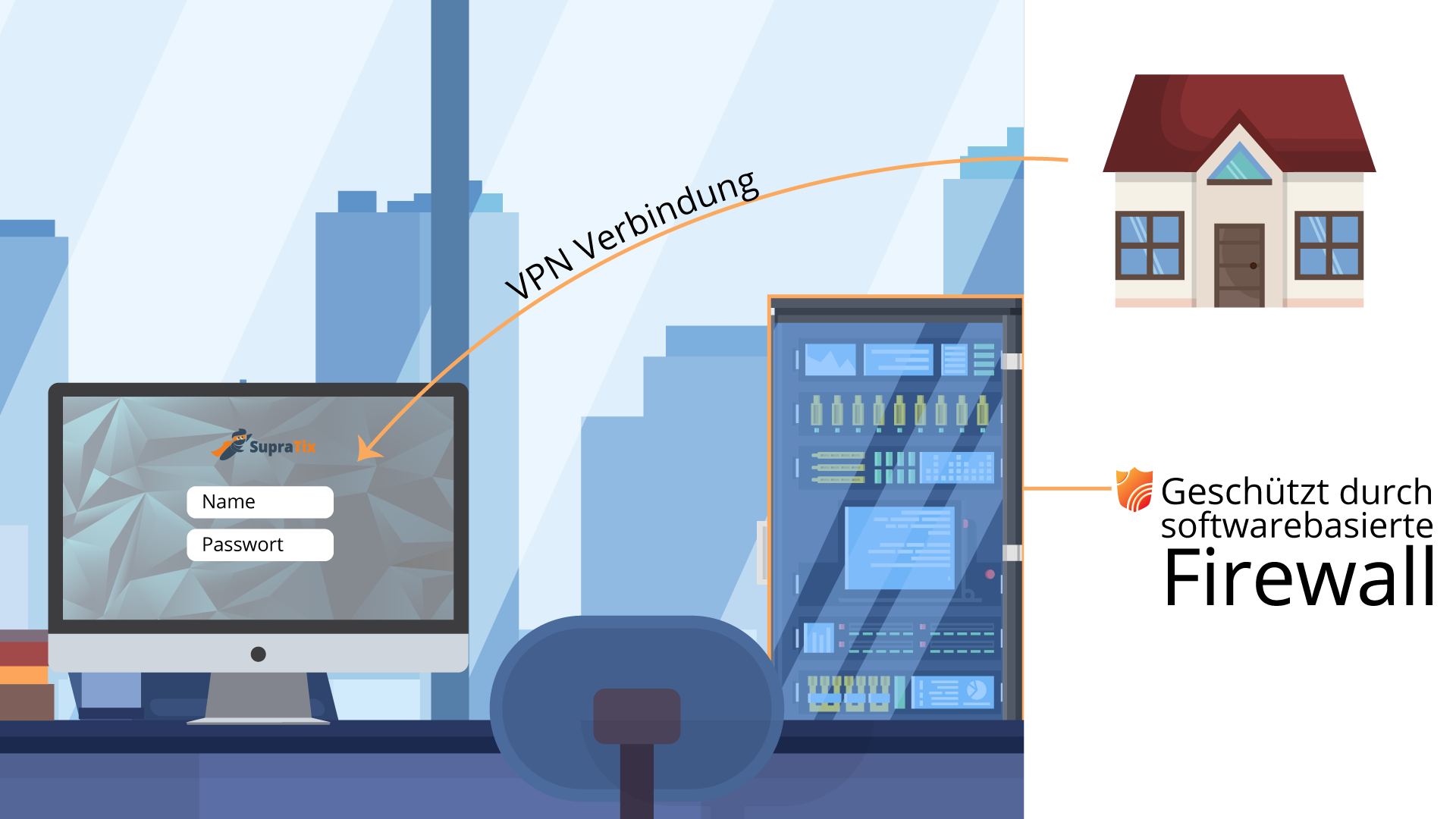 Die Administration erfolgt über das Internet mittels verschlüsselter Verbindungen. Der Zugang zu Rechnern in den Büroräumen der SupraTix wird über Benutzerkonten kontrolliert. Hierzu hat jeder Mitarbeiter auf seinem Rechner ein eigenes Benutzerkonto. Der Zugriff auf das bürointerne Netzwerk außerhalb der Büroräume ist ausschließlich über eine VPN Verbindung (Virtual Private Network) möglich. Das bürointerne Netzwerk wird ebenfalls von einer softwarebasierten Firewall geschützt. Der Zugang zu den Datenverarbeitungssystemen ist mit Benutzerkennung und einem sicheren Authentifizierungsverfahren geschützt. Es sind Regeln zur Bildung eines sicheren Passworts festgelegt. Die Zugänge sind mit einer sicheren „Pausenschaltung“ geschützt.