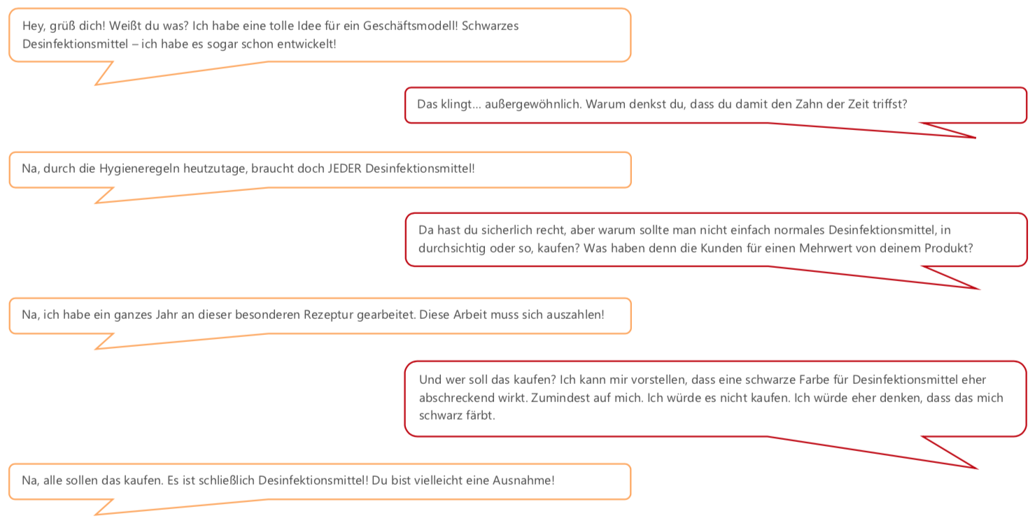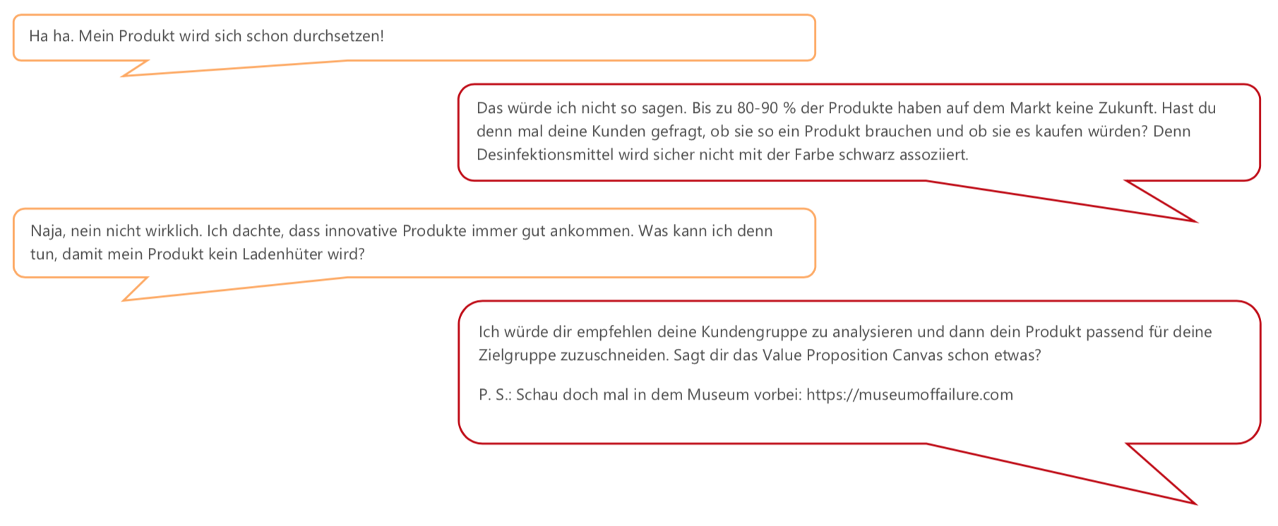 Betrachten Sie zunächst folgenden Dialog. Was er zeigt ist, dass es einen nicht verwundert, dass Studien zeigen, dass 80 – 90 % der auf den Markt gebrachten Produkte scheitern, wenn man sie am Kunden vorbei- bzw. gänzlich ohne ihn entwickelt. Wenn Sie nicht wollen, dass Ihre Produkt- oder Dienstleistungsideen ebenfalls in dieser Statistik landen, dann ist die Value Proposition Canvas-Methode, um die es gleich gehen wird, eine, die Sie für die erfolgreiche Entwicklung einer Geschäftsmodellidee sehr gut gebrauchen könnten!