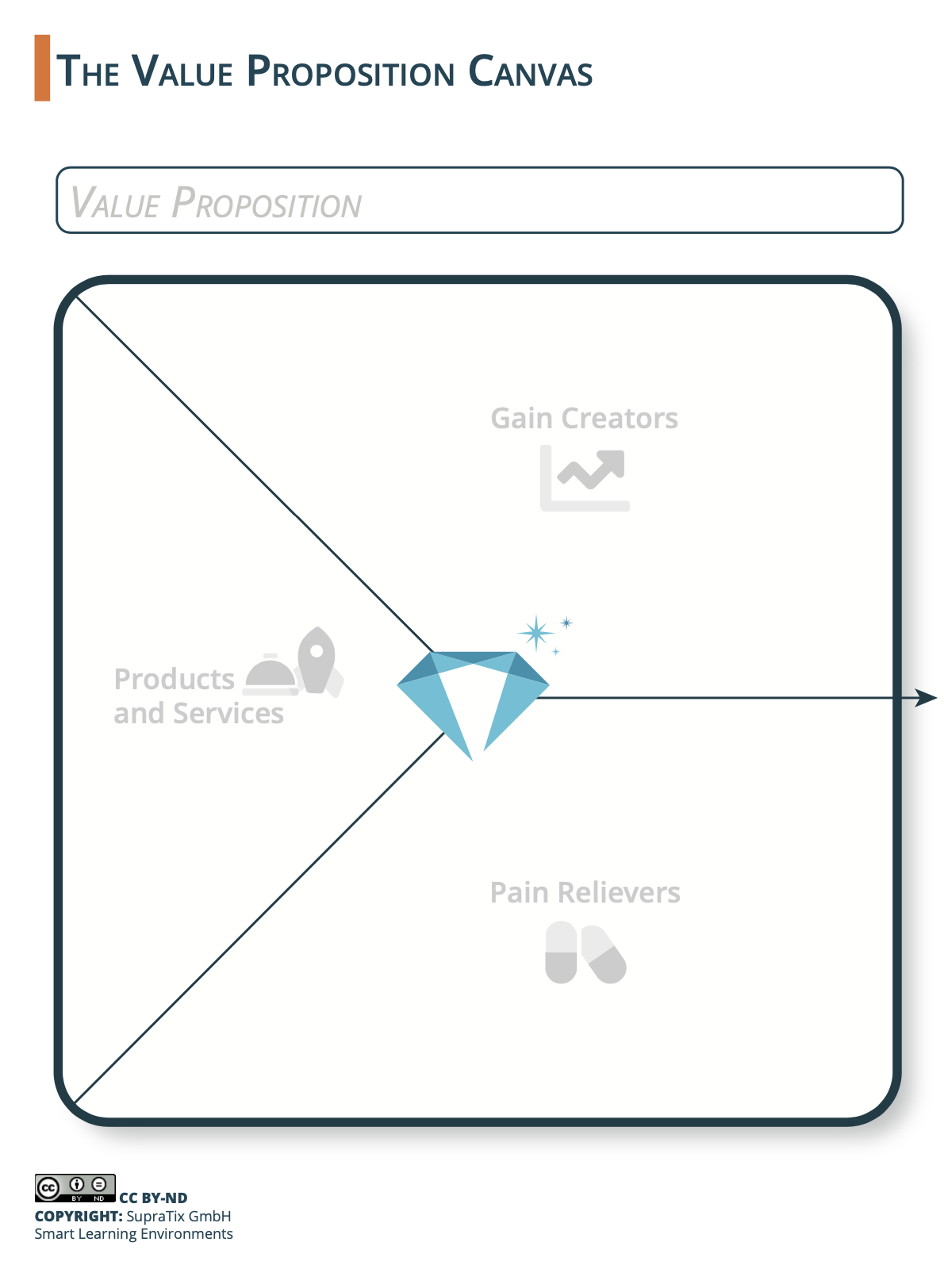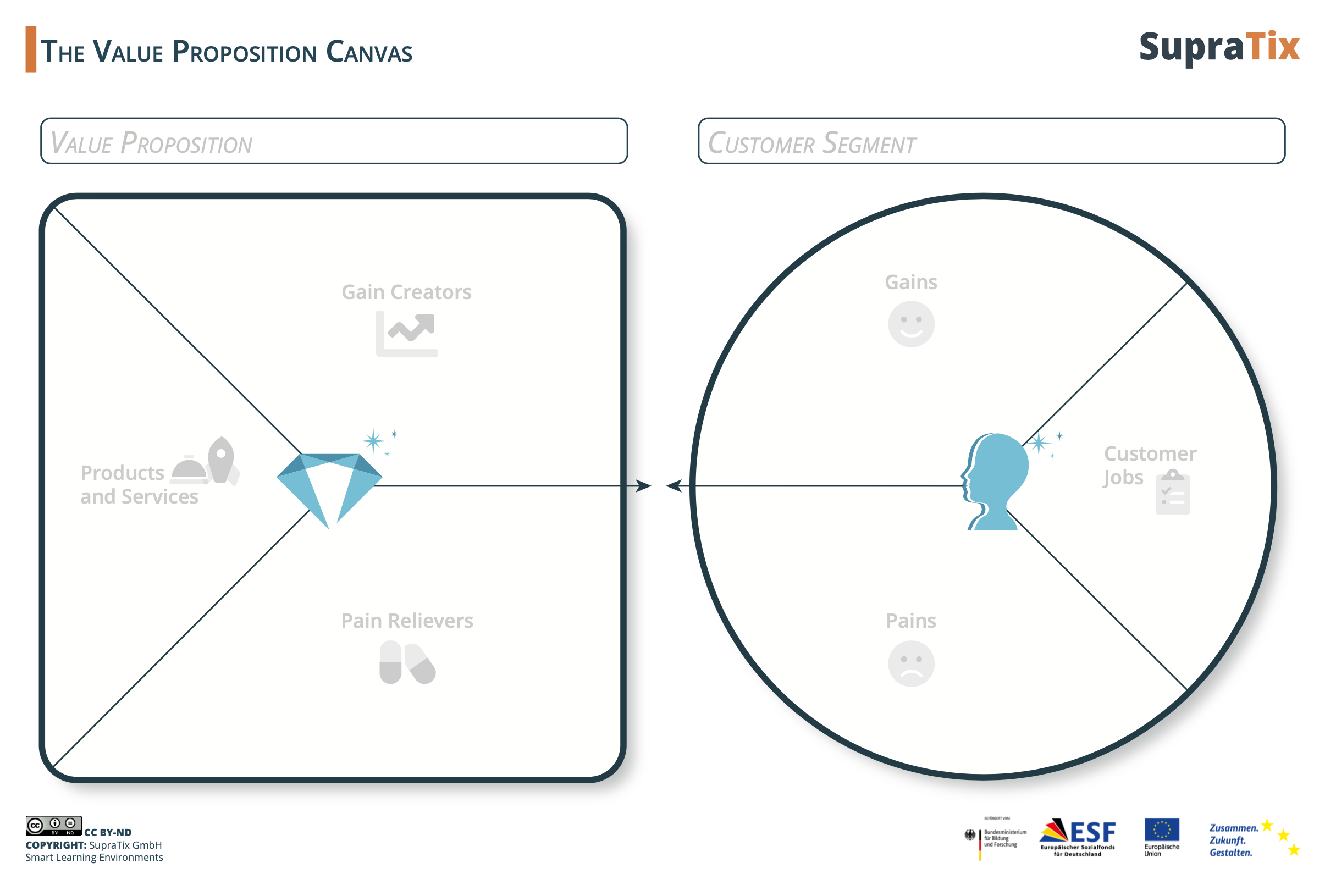 Ziel: Bei der Methode werden zwei Seiten einer Vorlage mit jeweils drei Segmenten gegenübergestellt, analysiert bzw. visualisiert. Dabei handelt es sich um ein Kundensegment und dem Werteversprechen eines Angebots. Wird hierbei ein vollständiger Einklang erreicht, kann von einer exakten Adressierung der Kundeninteressen durch das Produkt und damit von einer Abnahme auf dem Markt ausgegangen werden.