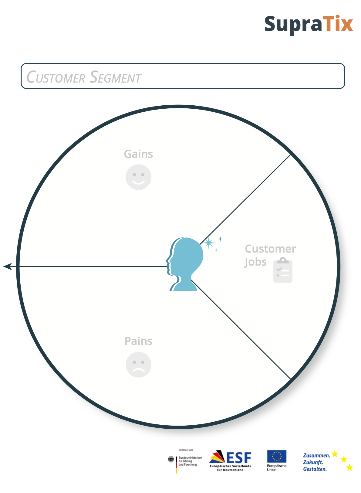 | Vorab zu klärende Fragen | Bevor das Ausfüllen der Vorlage beginnen kann, sollte es eine einvernehmliche Vorstellung bezüglich der Persona des betrachteten Kunden geben. Nur wenn alle Teilnehmer dieselbe Kundengruppe vor Augen haben, können Jobs, Pains und Gains konstruktiv gemeinsam ermittelt werden. Zudem gilt es, sich zu fragen, wer die entsprechenden Abnehmer und deren Bedürfnisse besonders gut kennt und einschätzen kann und diese Personen, falls möglich, am Prozess zu beteiligen. Schlussendlich ist es auch wichtig zu wissen, welche der Annahmen hinsichtlich der Kundschaft auf Erfahrungen, Beobachtungen oder Interviews basieren. |
