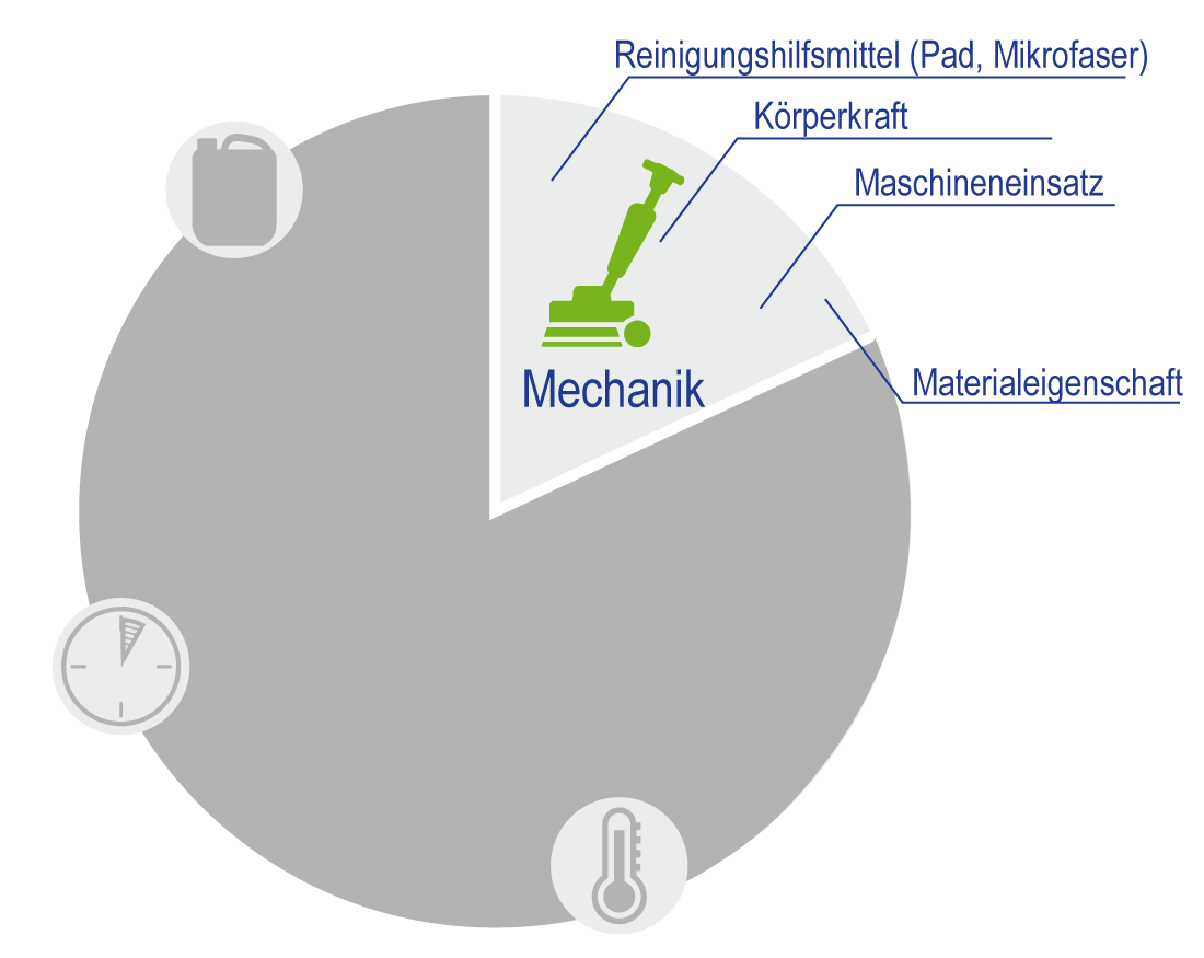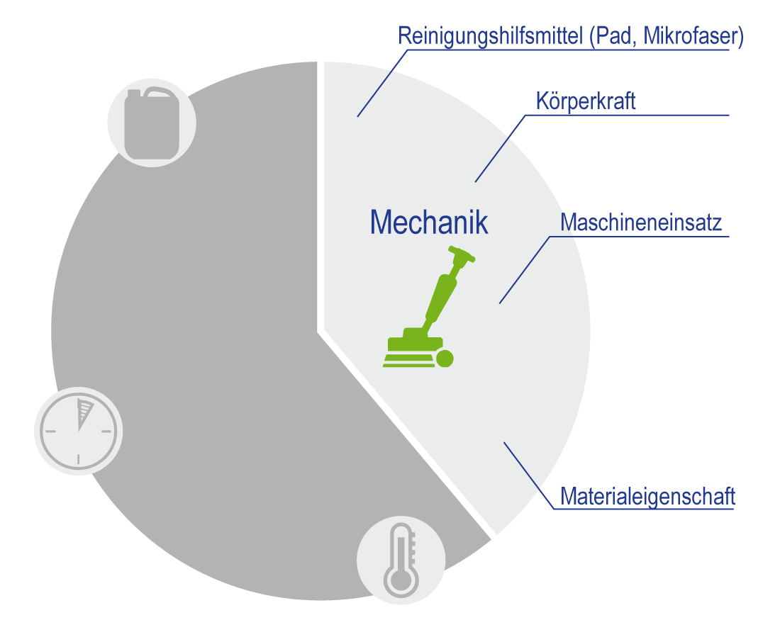 Ist der Kontakt zwischen Reinigungsmittel und Reinigungsoberfläche bzw. die Technik sowie der Einsatz der Körperkraft (z. B. beim Wischen einer Oberfläche, beim Schrubben, etc.), die zum Lösen des Schmutzes eingesetzt wird.