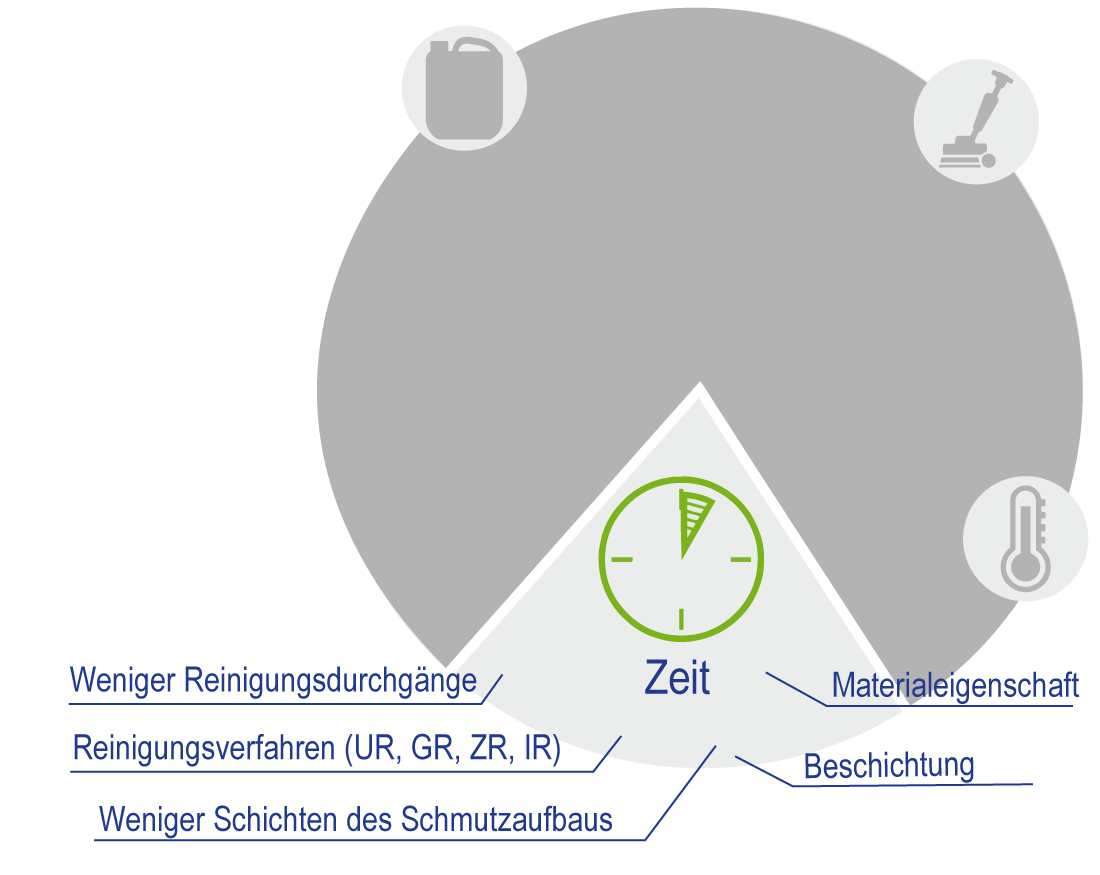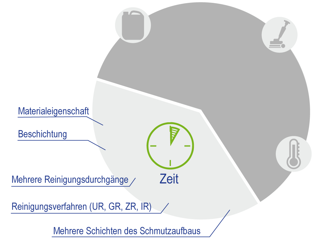 Hierbei sind die Einwirkzeit und die Arbeitszeit gemeint. Es gibt Tätigkeiten, die durch eine Veränderung der Reinigungsfaktoren verkürzt oder verlängert werden können.