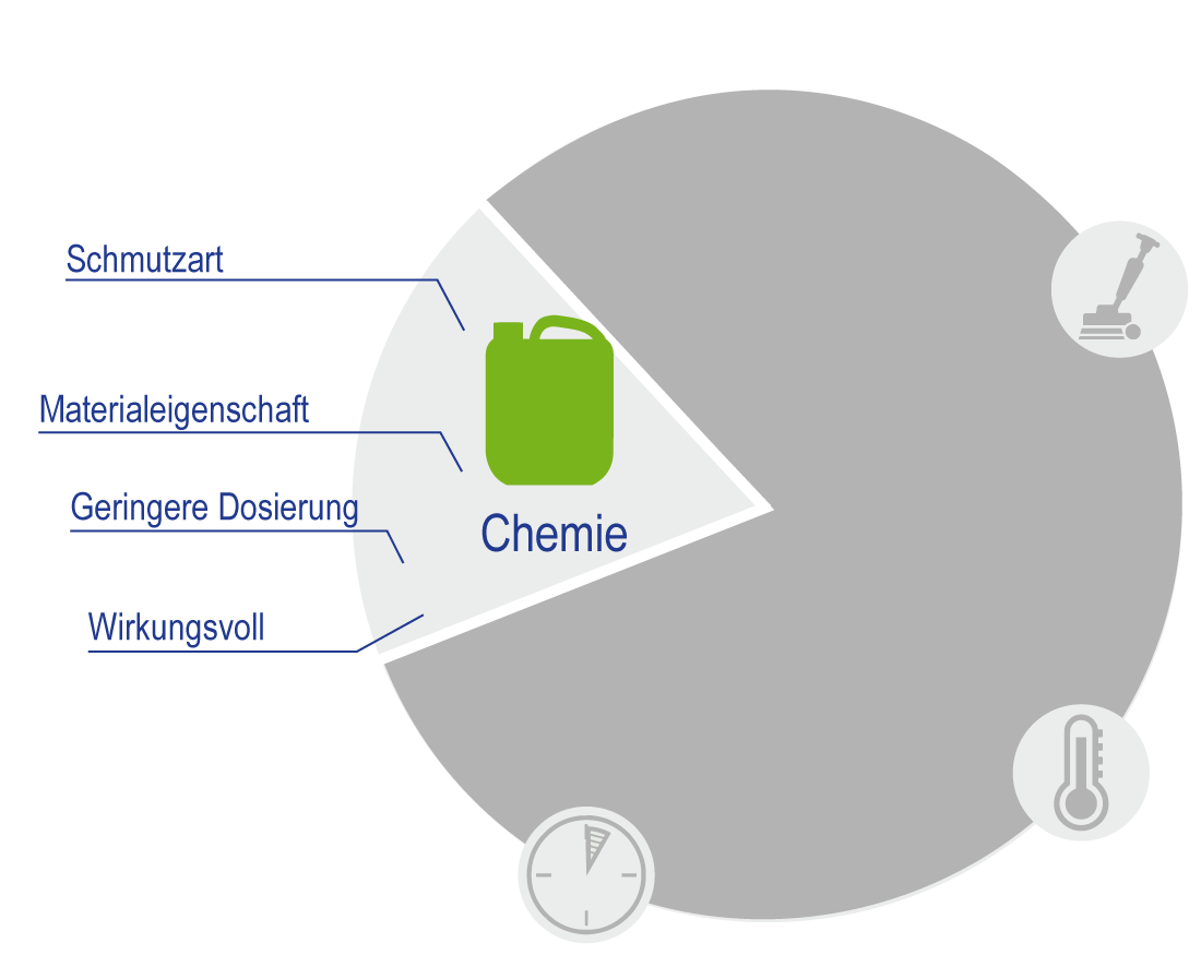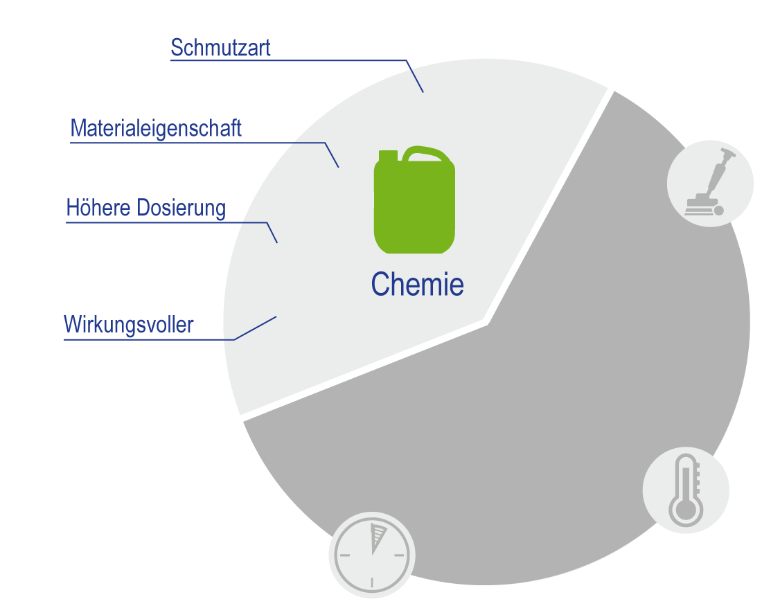 Um ein effektiv und effizient gutes Reinigungsergebnis zu erzielen, müssen die 4 Faktoren gut aufeinander abgestimmt sein. Dazu stehen sie in einem festen Verhältnis zueinander und müssen zusammen immer 100% ergeben.