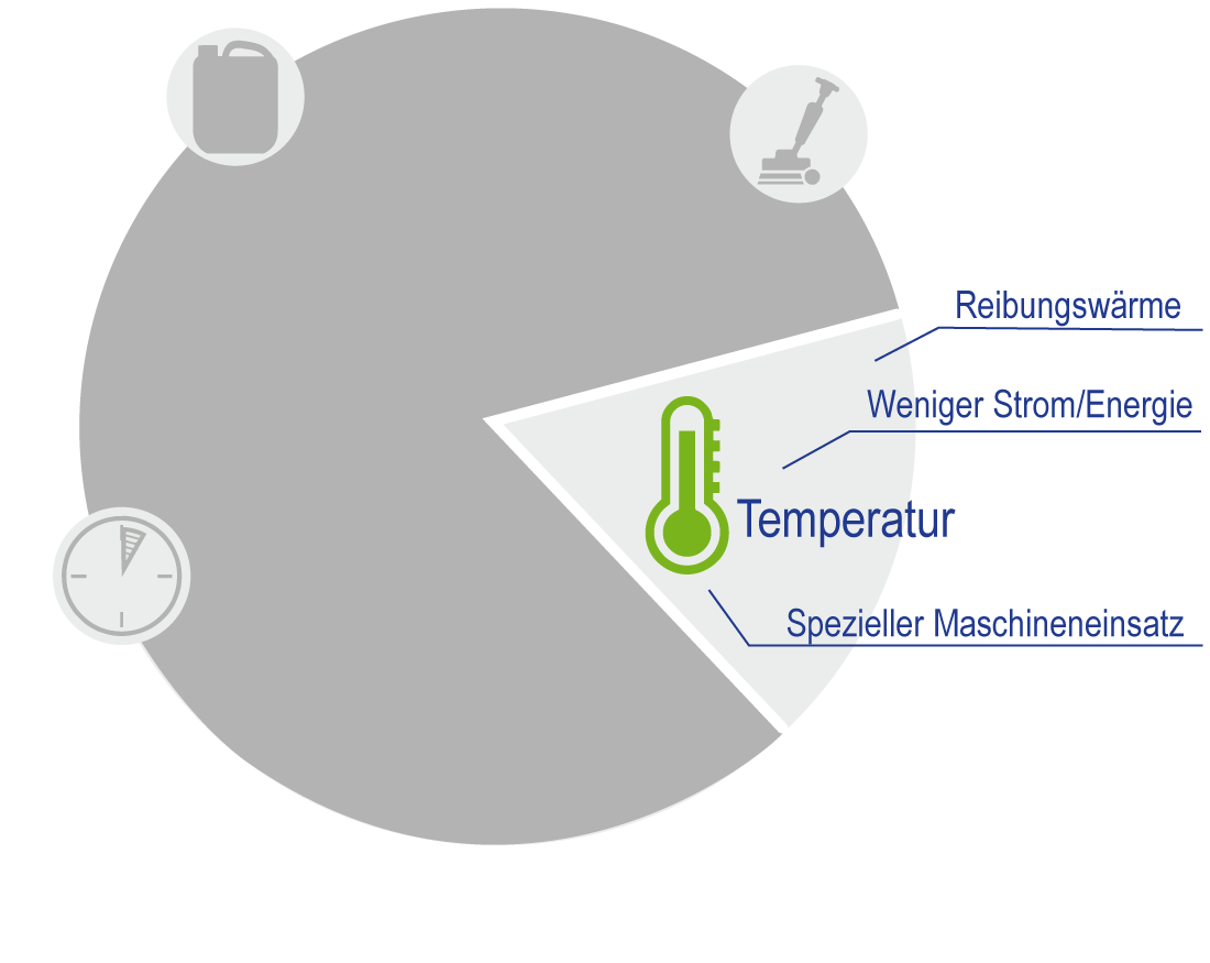 Bei einem bestimmten Reinigungsvorgang ergibt sich ein bestimmter Sinner’scher Kreis. Um Energiekosten zu sparen und umweltfreundlicher zu reinigen, kann man z. B. mit weniger Temperatur arbeiten. Allerdings muss dann ein Faktor oder die anderen Faktoren dies ausgleichen. Bei weniger Temperatur kann man z. B. die Mechanik vergrößern, um trotzdem ein gutes Reinigungsergebnis zu erzielen. Für mehr Informationen zu den einzelnen Faktoren, klicken Sie einfach auf das am Sinner’schen Kreis.